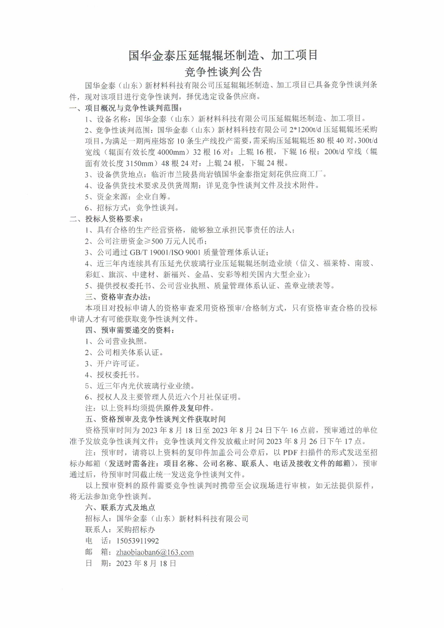 国华金泰压延辑辊坏制造、加工项目 竞争性谈判公告