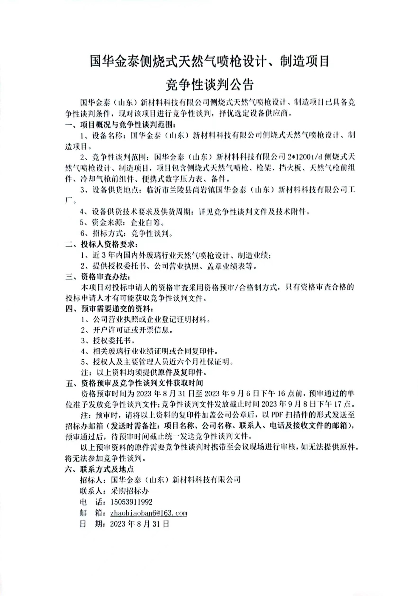 国华金泰侧烧式天然气喷枪设计、制造项目竞争性谈判公告