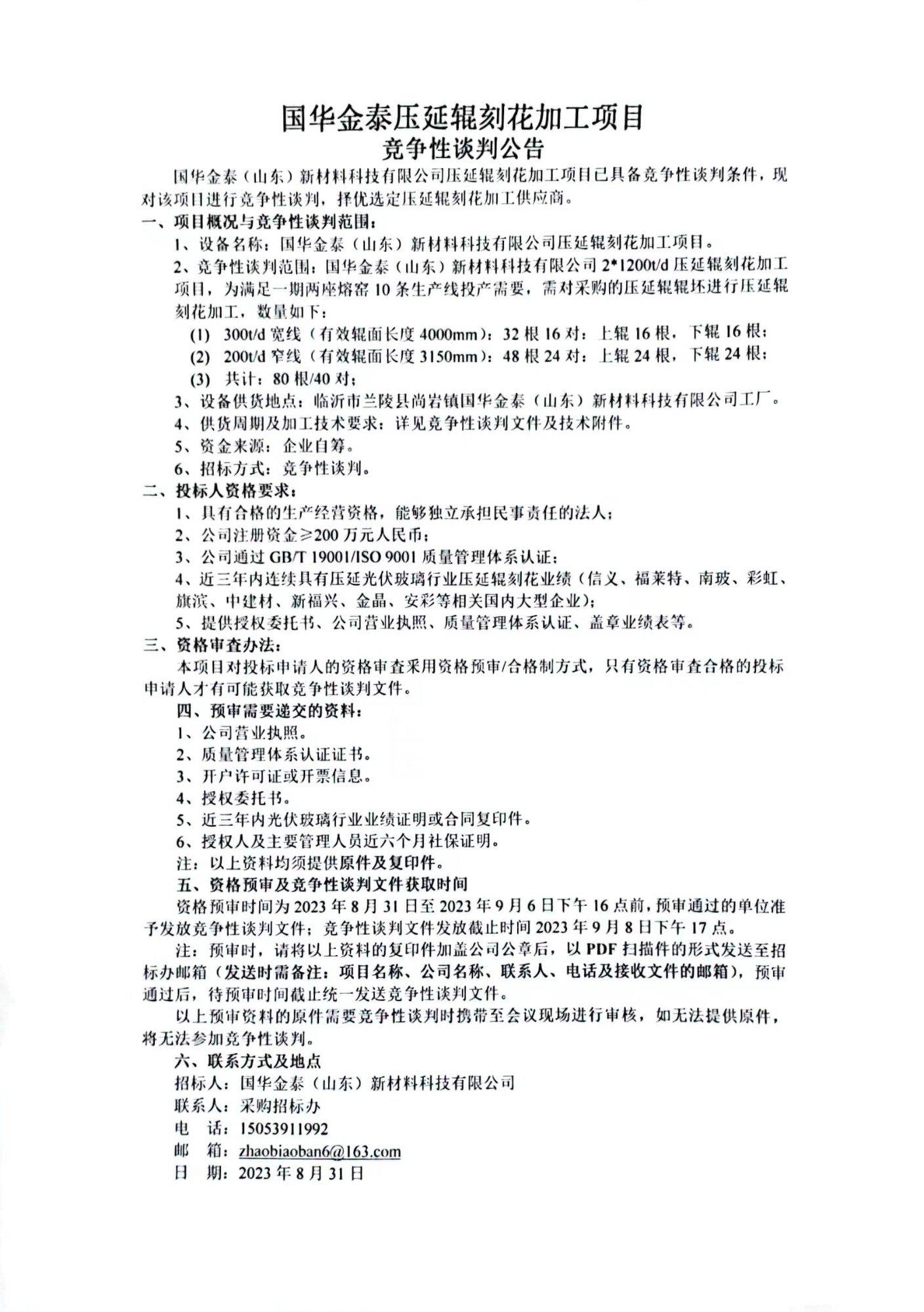 国华金泰压延辑刻花加工项目竞争性谈判公告