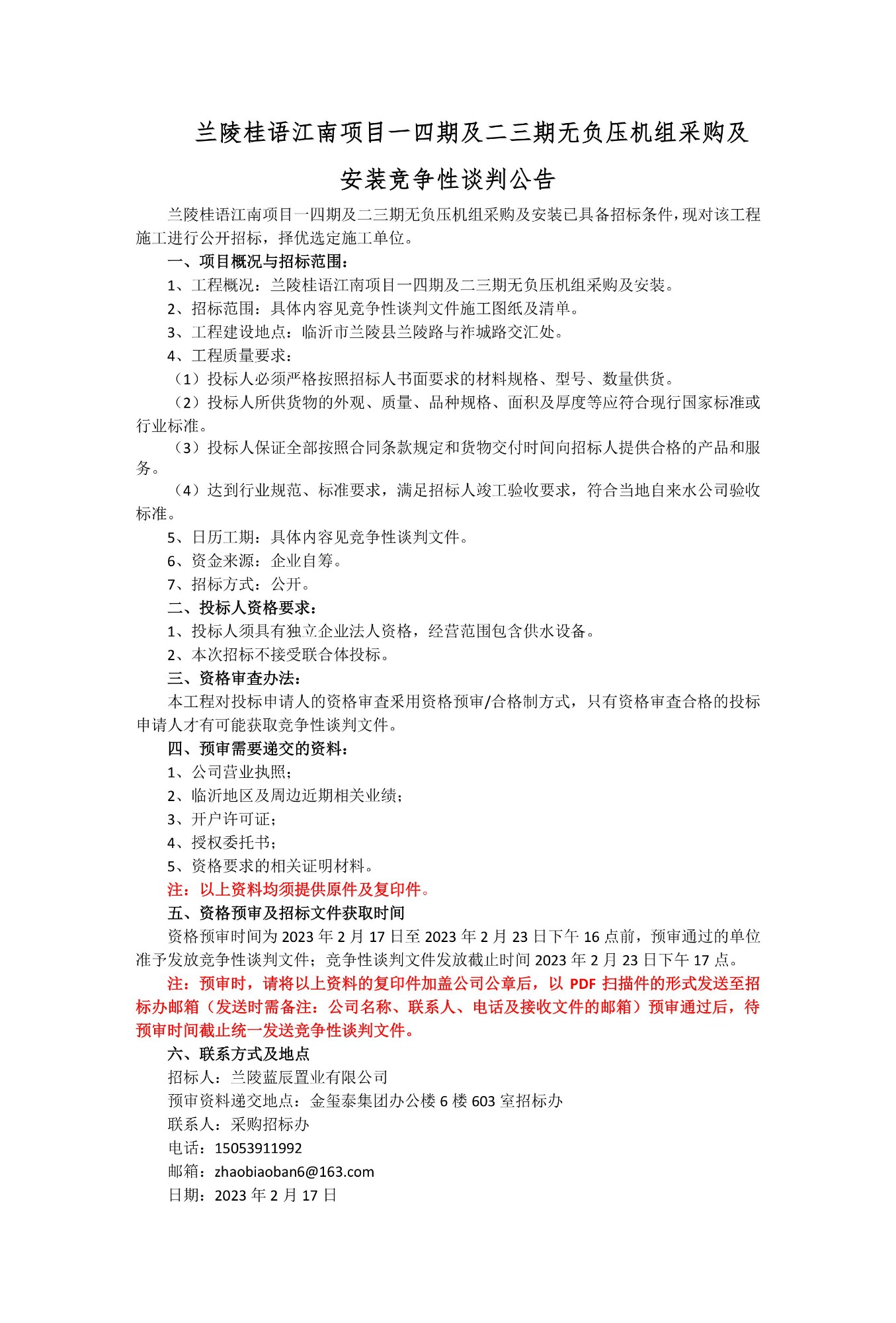 兰陵桂语江南项目一四期及二三期无负压机组采购及安装竞争性谈判公告